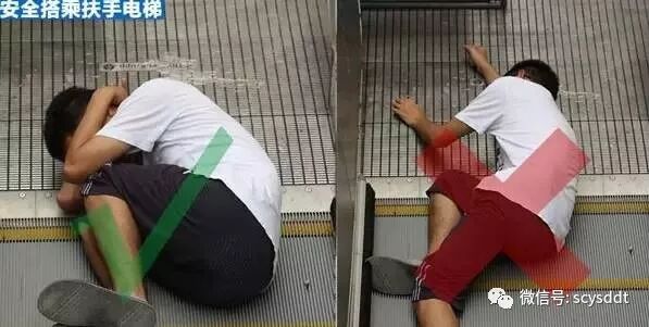 8、如不慎在扶梯上摔倒,应两手十指交叉相扣、护住后脑和颈部,两肘向前,护住双侧太阳穴。因为颈部受到强烈撞击会损伤神经,轻者易致瘫痪,重者危