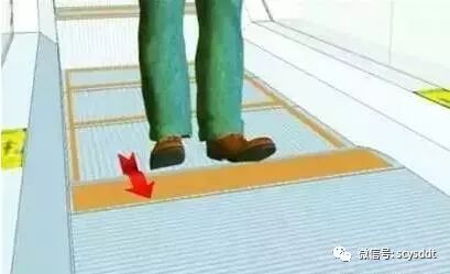 3、进入扶梯时,不要踩在两个阶梯的交界处,以免扶梯运行至倾斜段时,因前后阶梯的高差而摔倒。